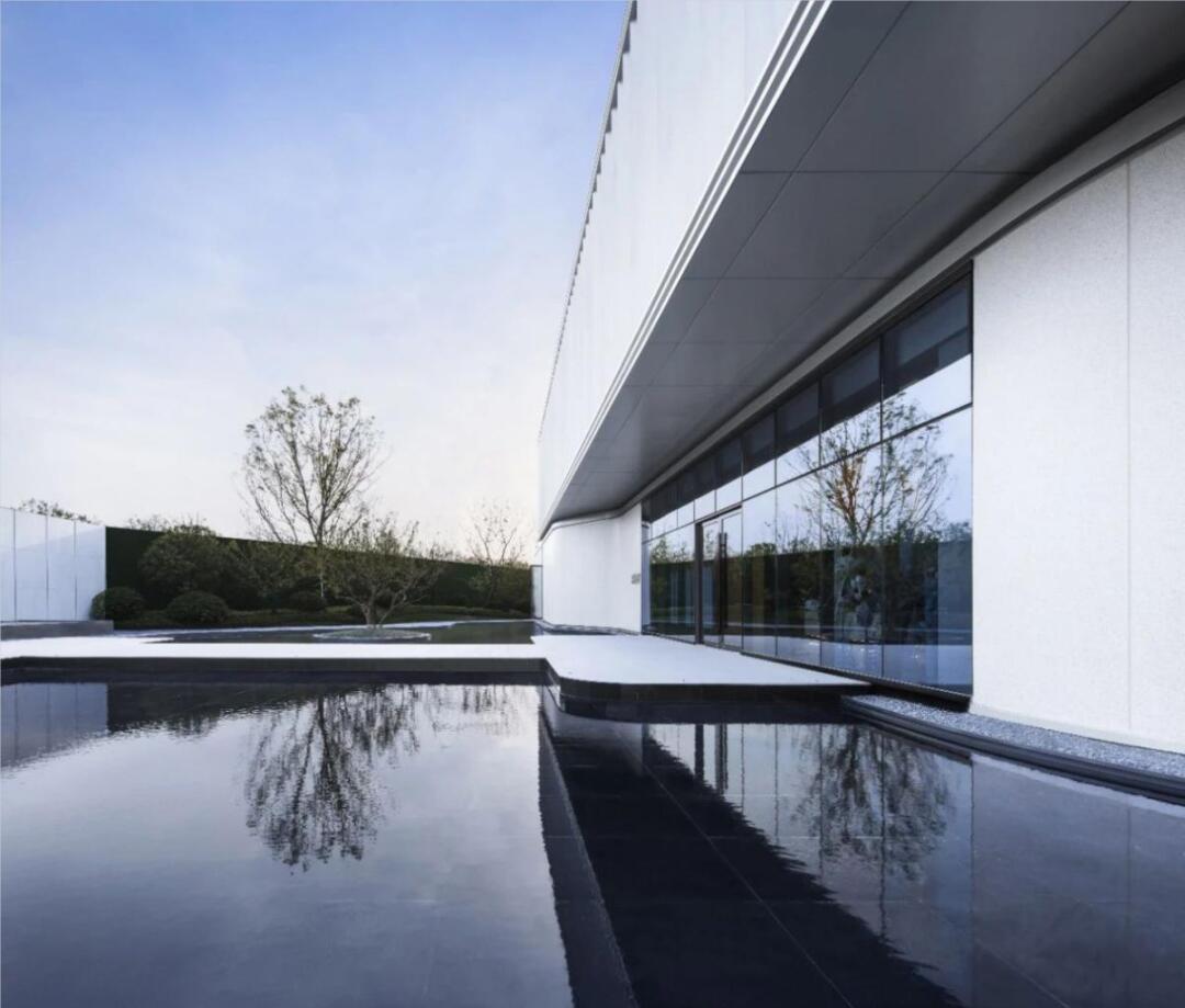 影漫步长廊后,水景粼粼,风静树止,水月交融。移步而过,微波荡漾的水面上摇曳着艺术生活馆的倒影。以现代造景手法,通过芬芳的植物参与形式可品的景观,充分体现融信以“品质地产领跑者,美好生活服务指南”的愿景。